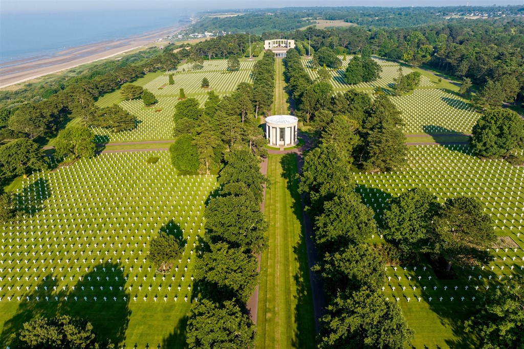 Dějiny Normandie: přístav Arromanches-les-Bains, Colleville-sur-Mer, pláž Omaha Beach a válečný hřbitov v Bayeux.
