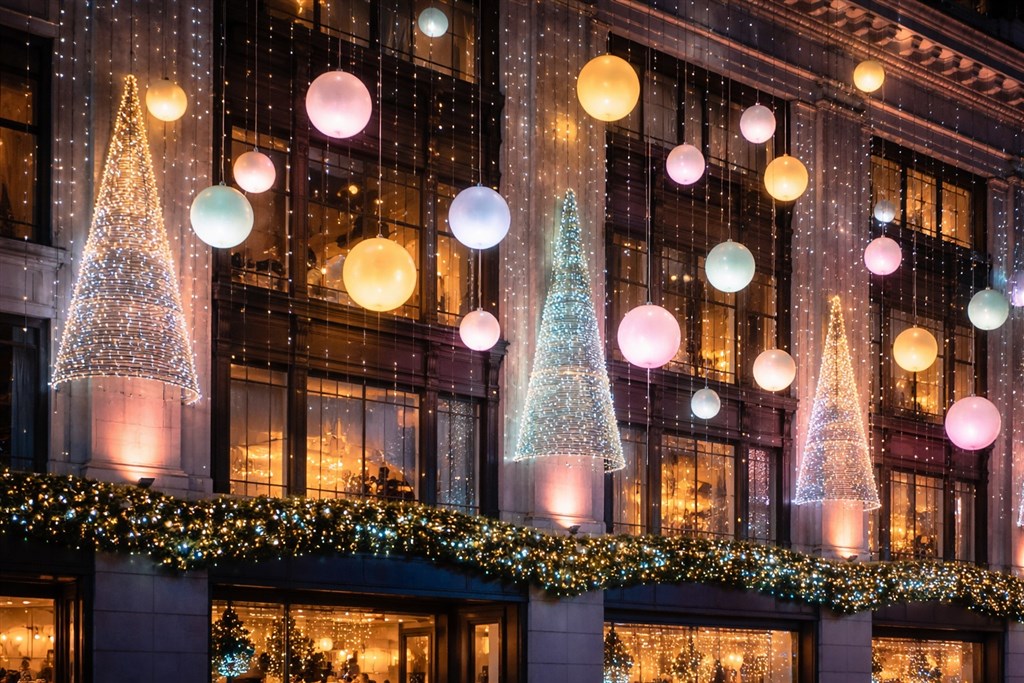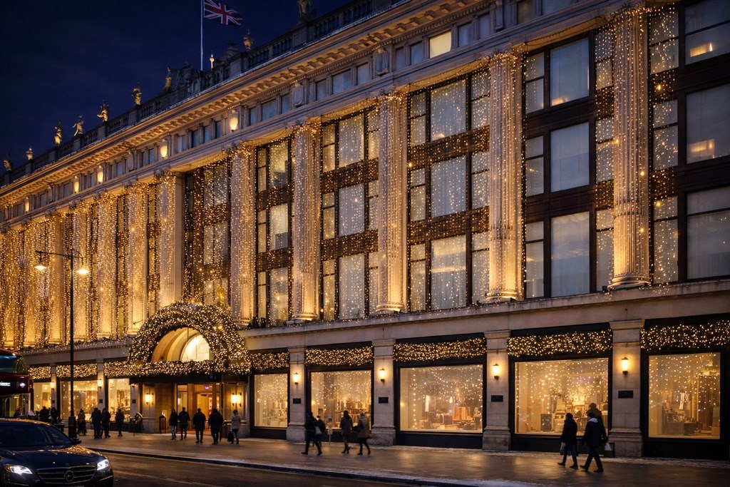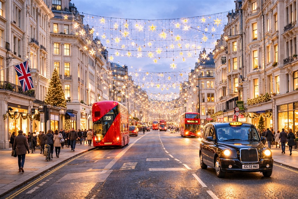 - Sváteční nákupy a světla – Oxford Street a Regent Street rozzářené adventní výzdobou.